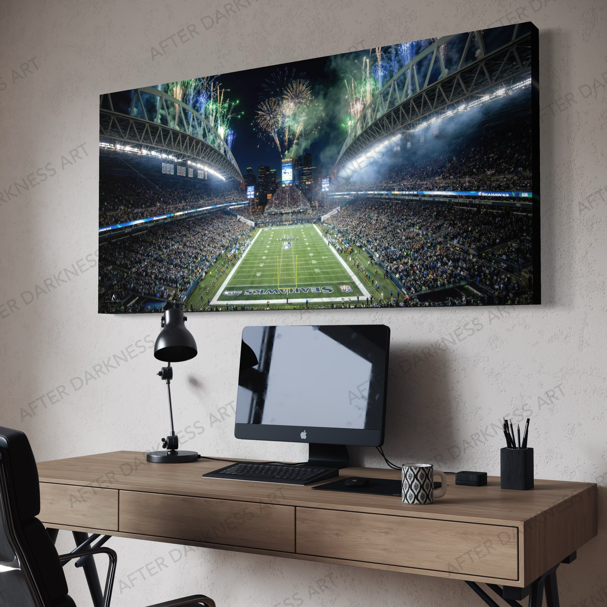 “Emerald City Erupts” freezes a moment of pure electricity as fireworks crown Lumen Field beneath the Seattle night. Light, motion, and sound collide capturing the raw energy of the Emerald City at full volume. This is a dream piece for a Seahawk’s fan.