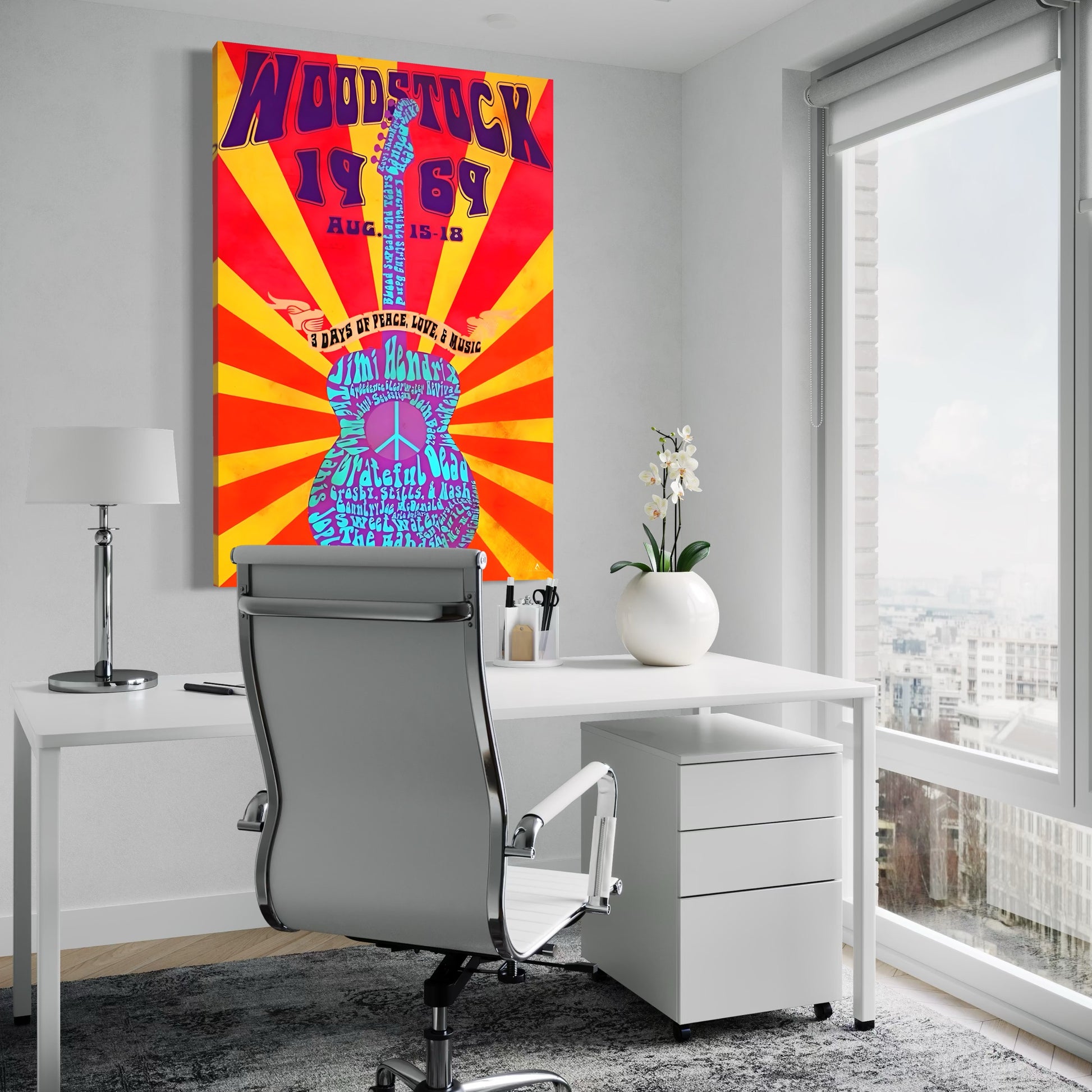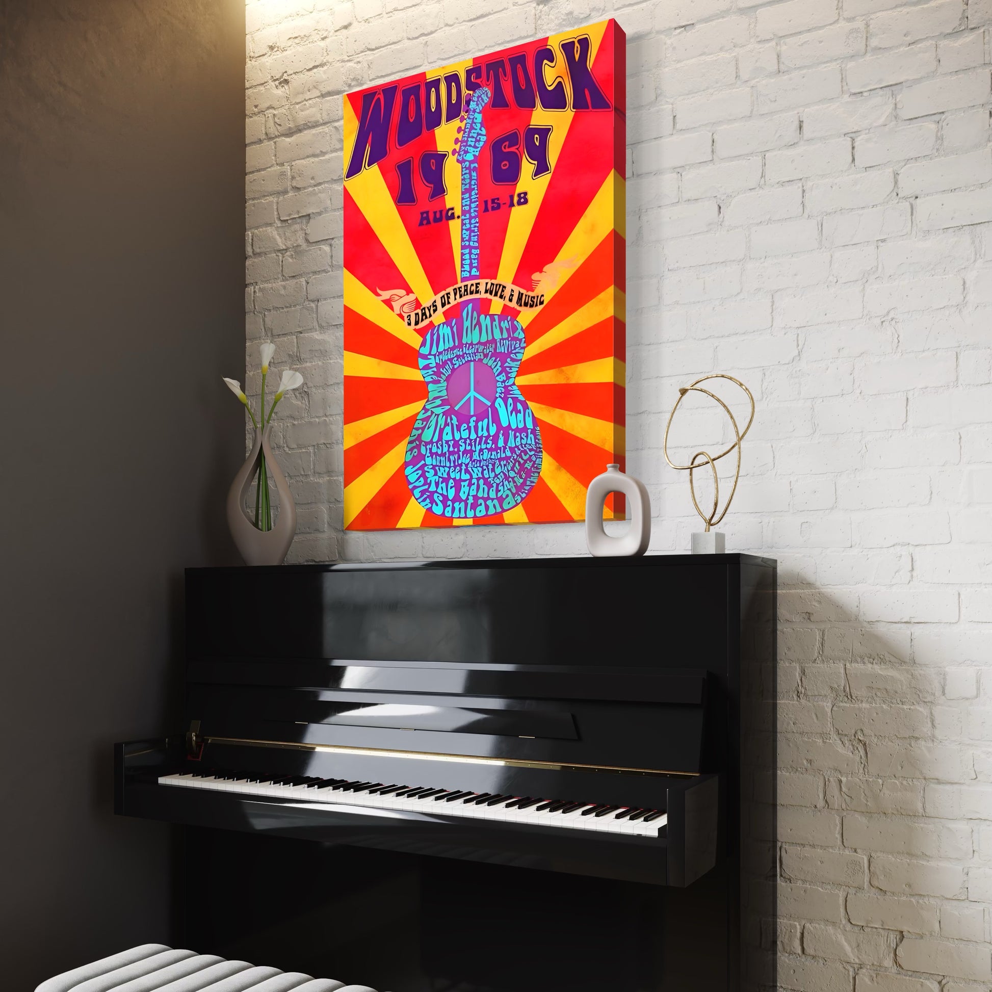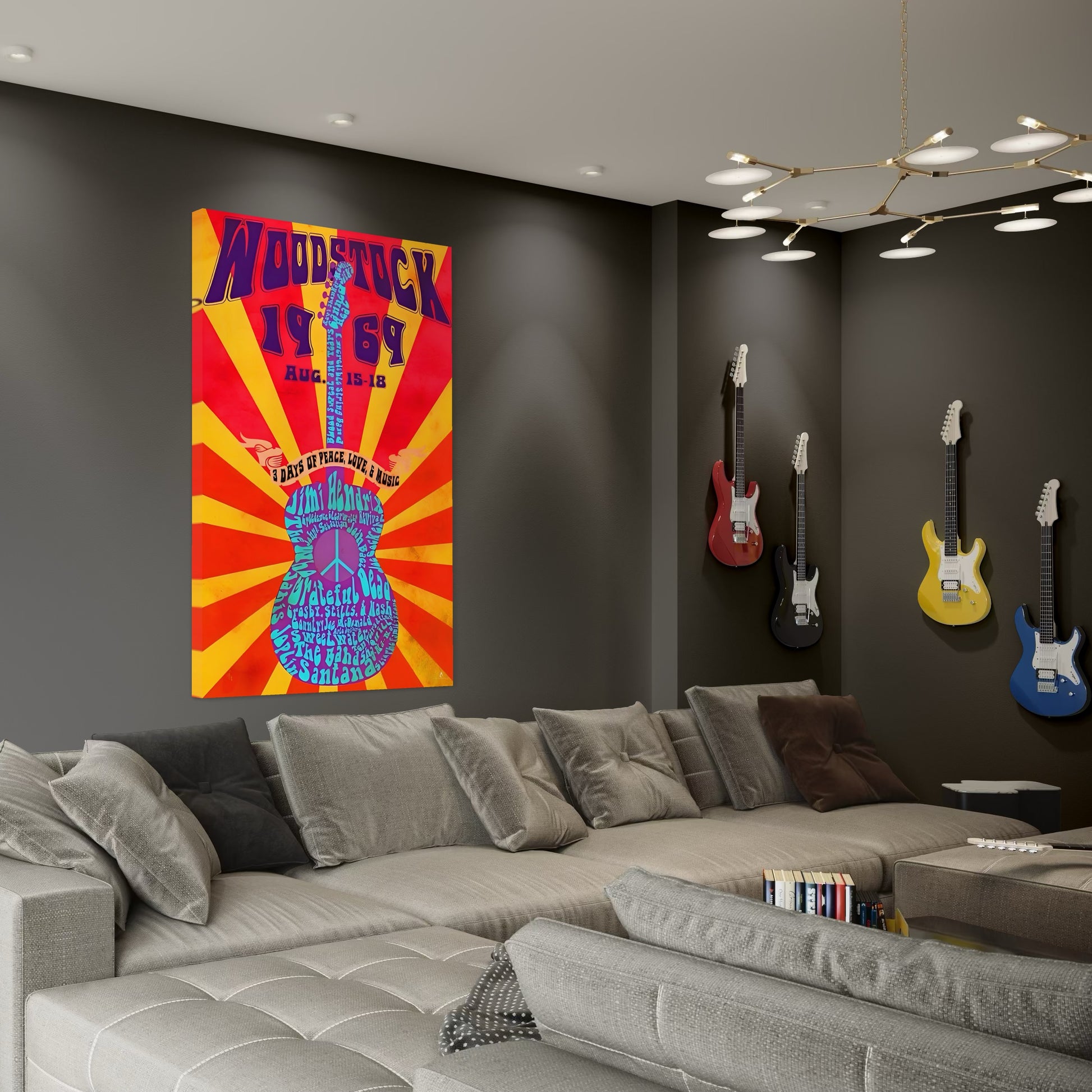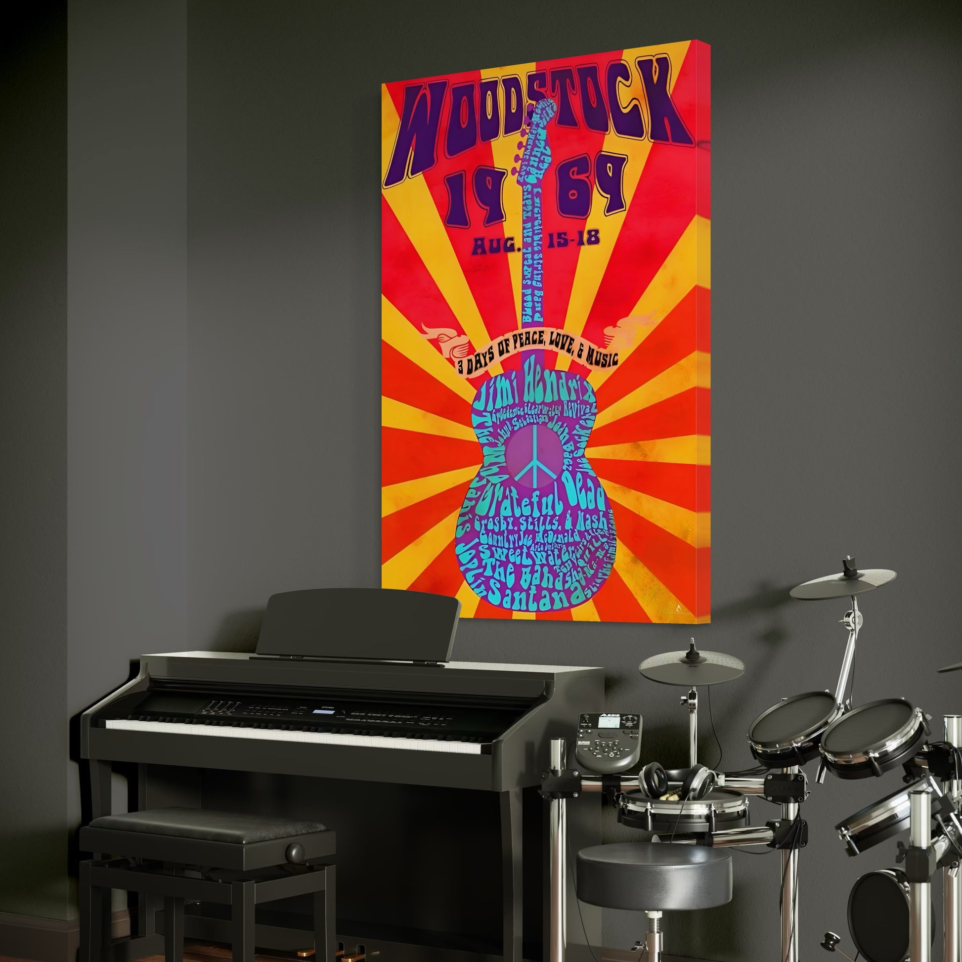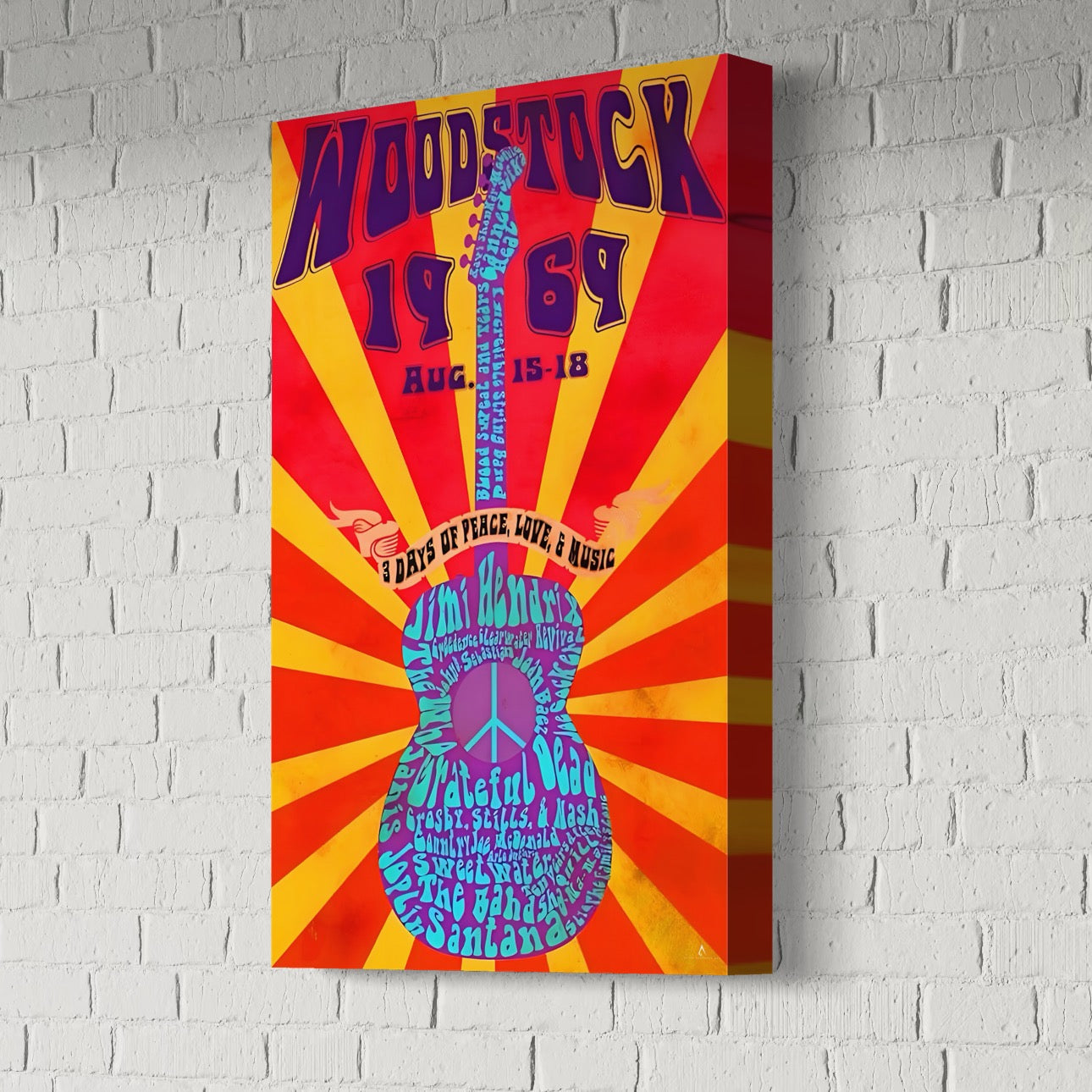 This is an actual Woodstock flyer design. A vibrant burst of vintage color and counterculture, this canvas captures the soul of 1969 in all its psychedelic glory. Centered around a groovy guitar radiating peace and power, it celebrates the legendary spirit of Woodstock with a beautifully aged aesthetic. Featuring icons like Jimi Hendrix, Janis Joplin, and the Grateful Dead, this bold tribute immortalizes three unforgettable days of peace, love, and music.